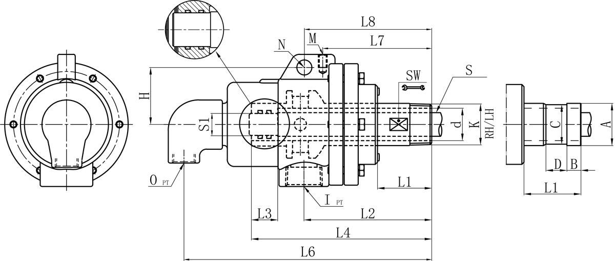 | Model | K | I | O | S | d | L1 | L2 | L3 | L4 | L6 | L7 | L8 | M | N | H | SW | 法蘭式外管尺寸對照表 | |||