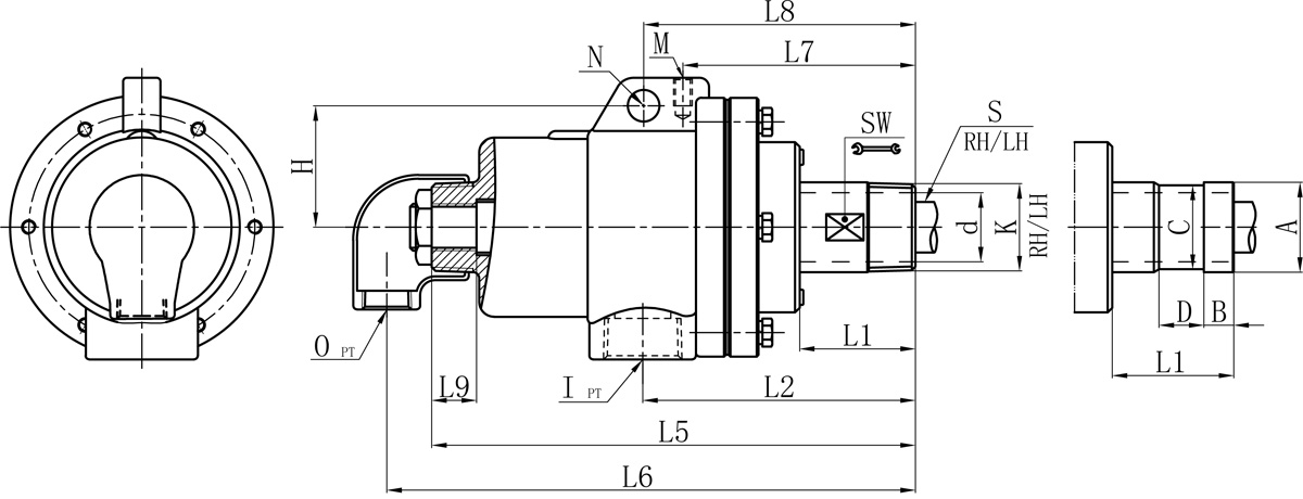 Model K I O S d L1 L2 L5 L6 L7 L8 L9 M N H SW 法蘭式外管尺寸對照表