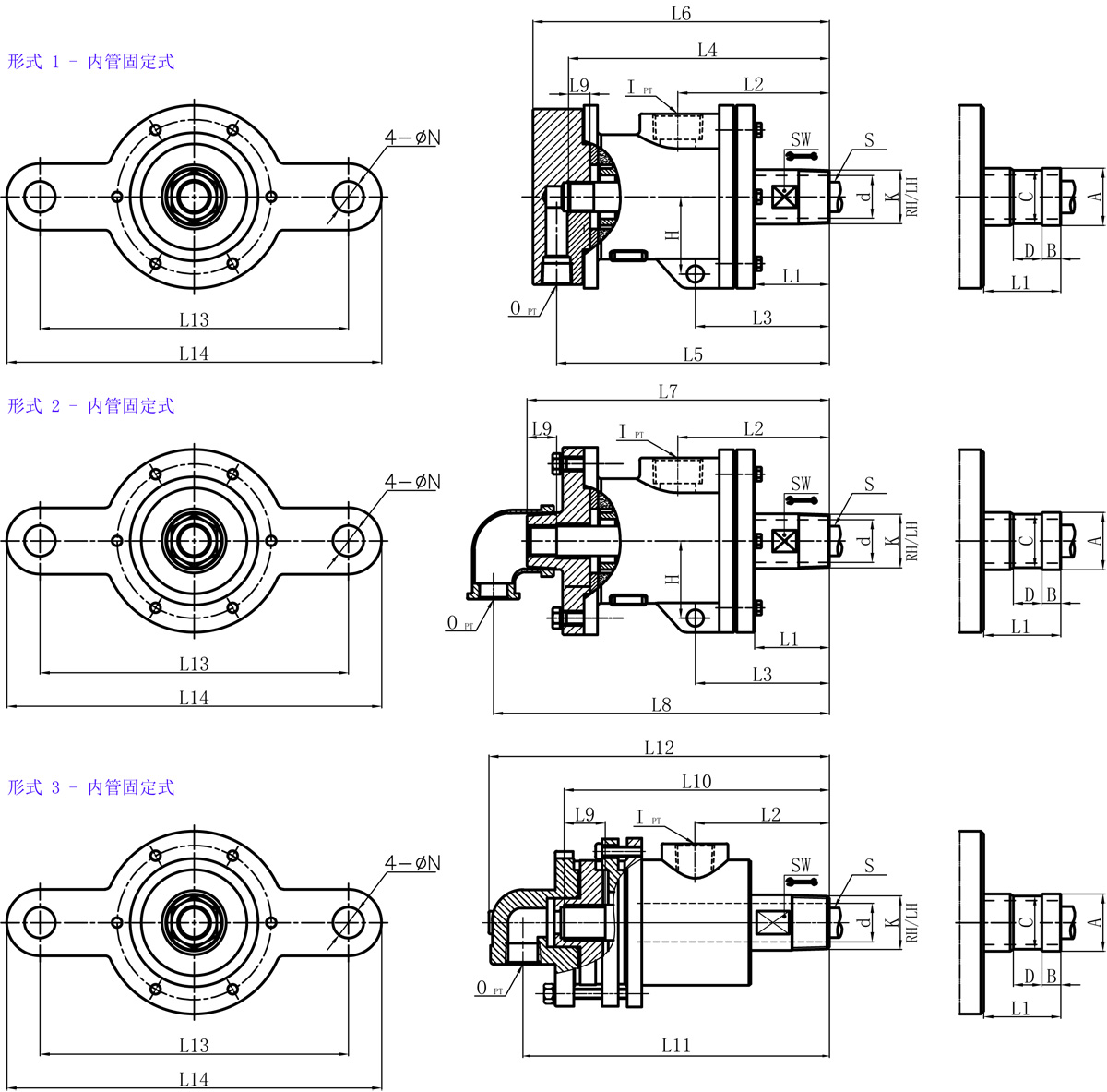 | Model | K | I | O | S | d | L1 | L2 | L3 | L4 | L5 | L6 | L7 | L8 | L9 | L10 | L11 | L12 | L13 | L14 | N | SW | H | 法蘭式外管尺寸對照表 | |||